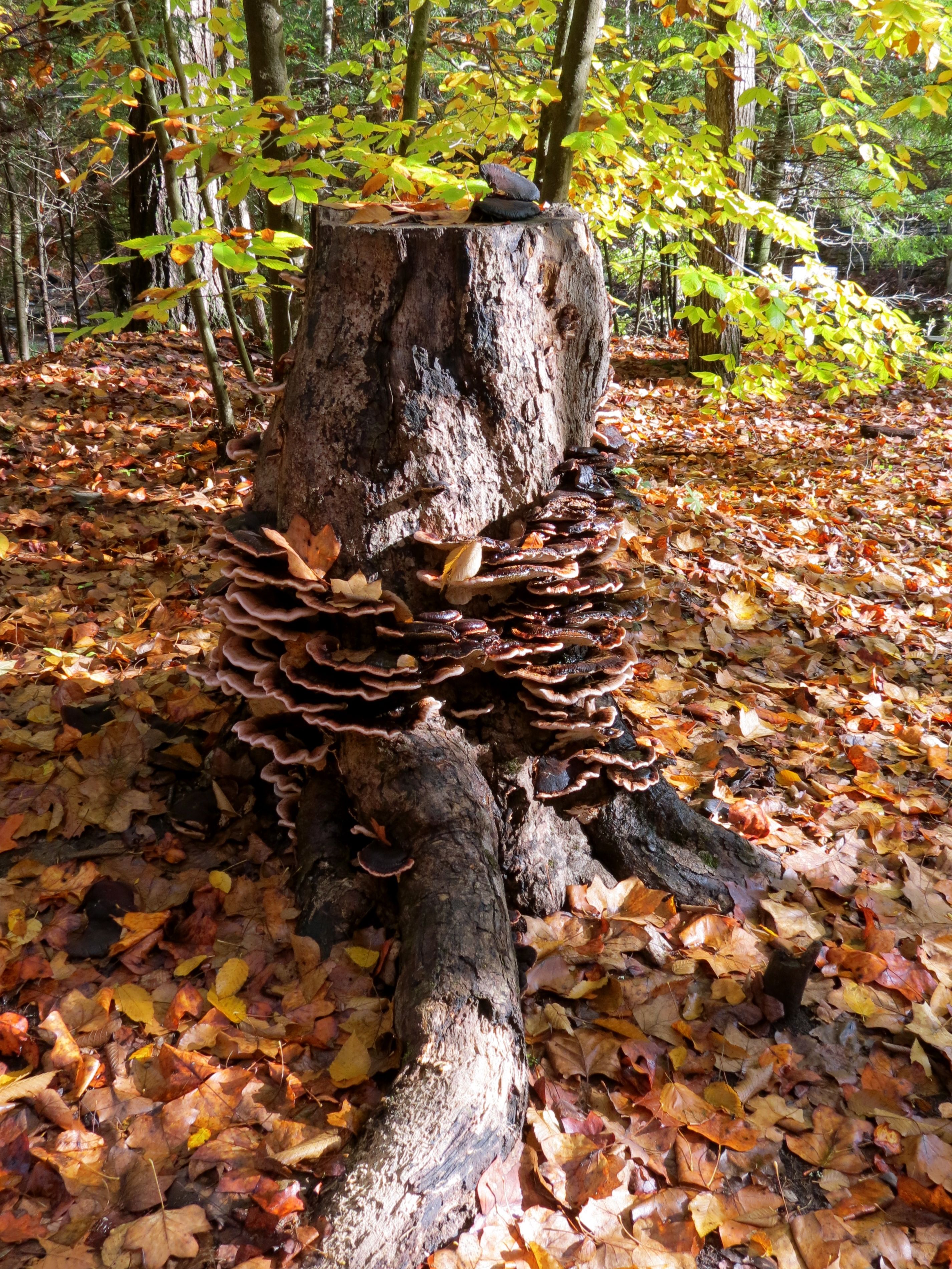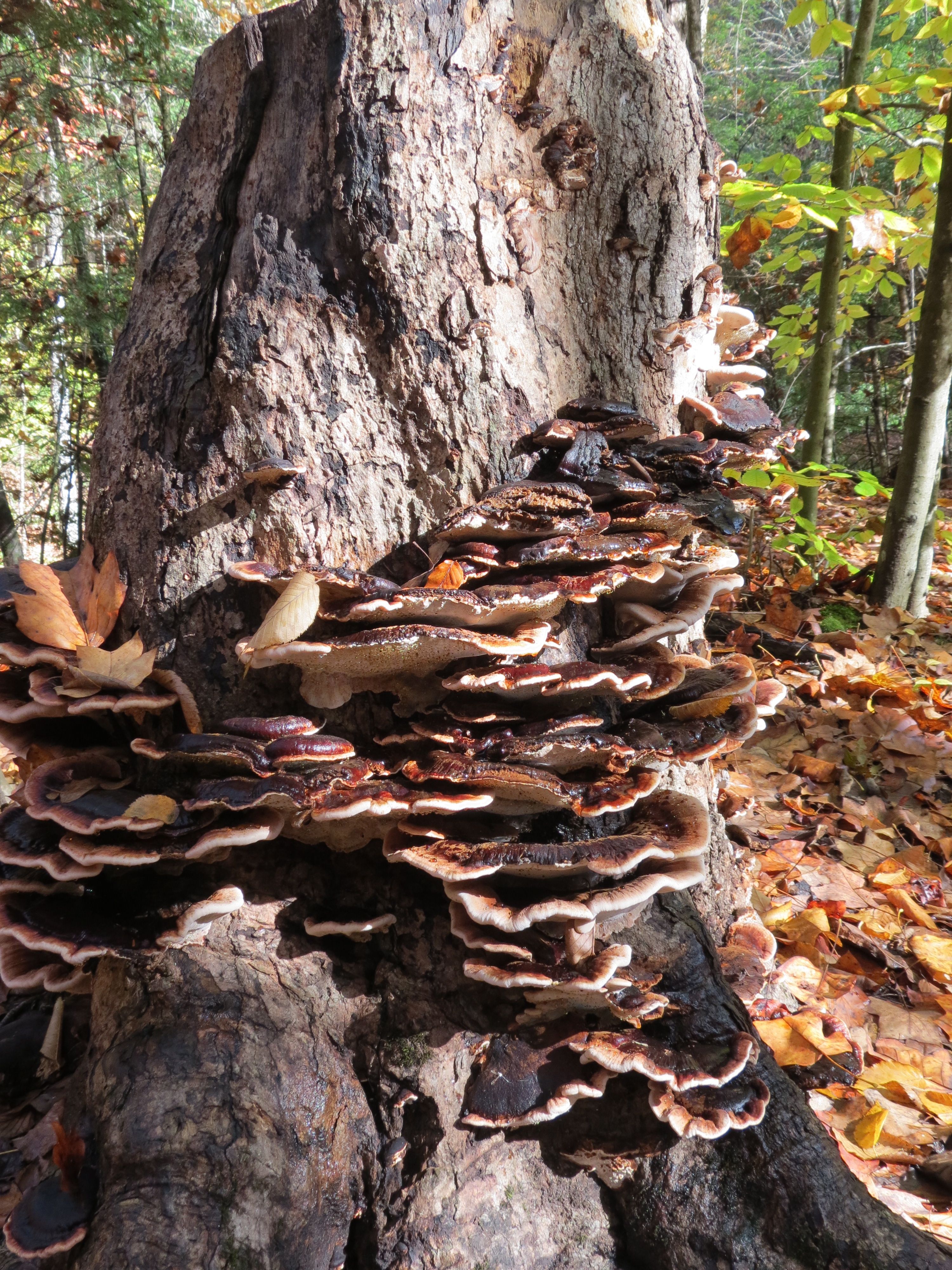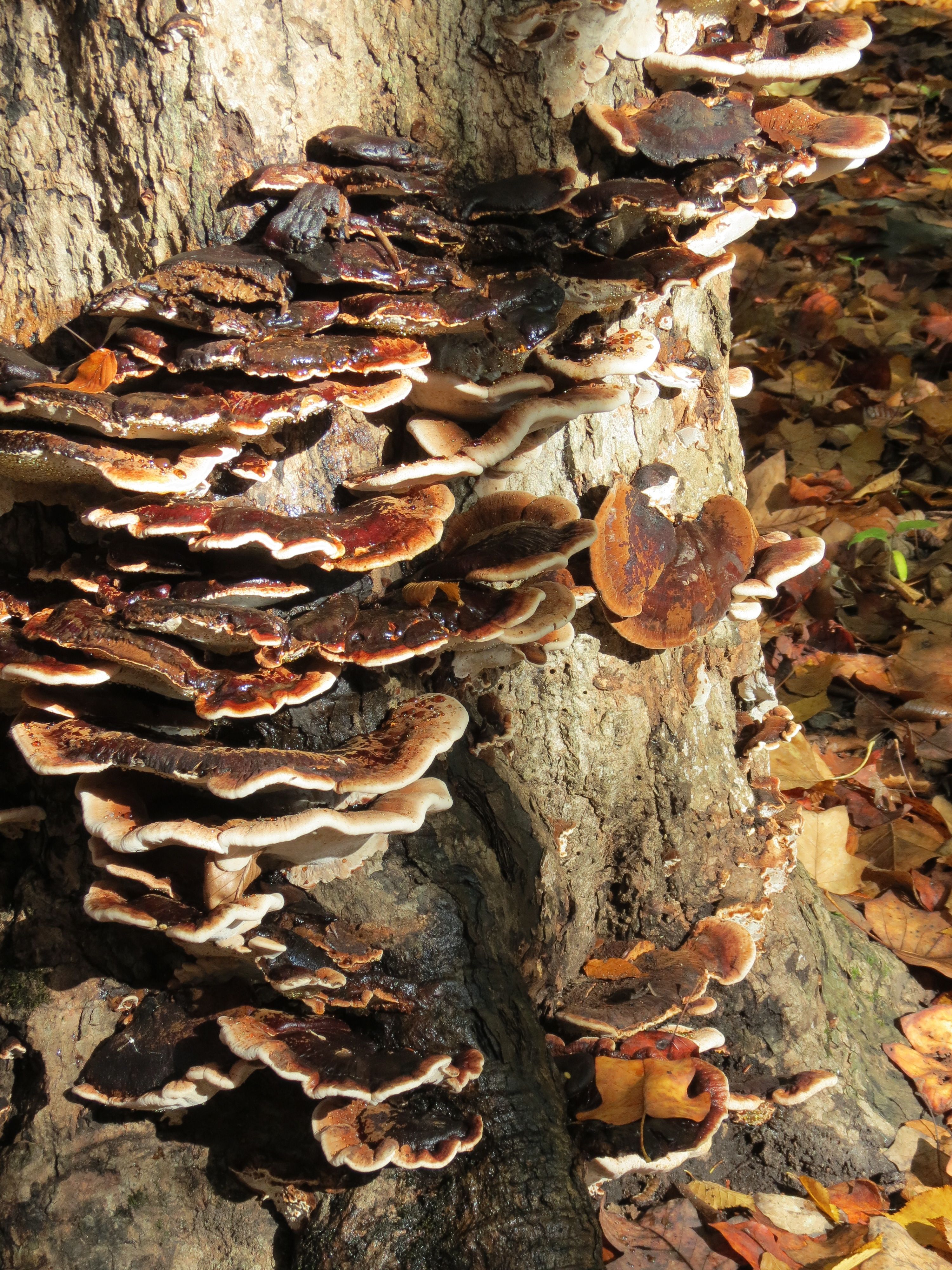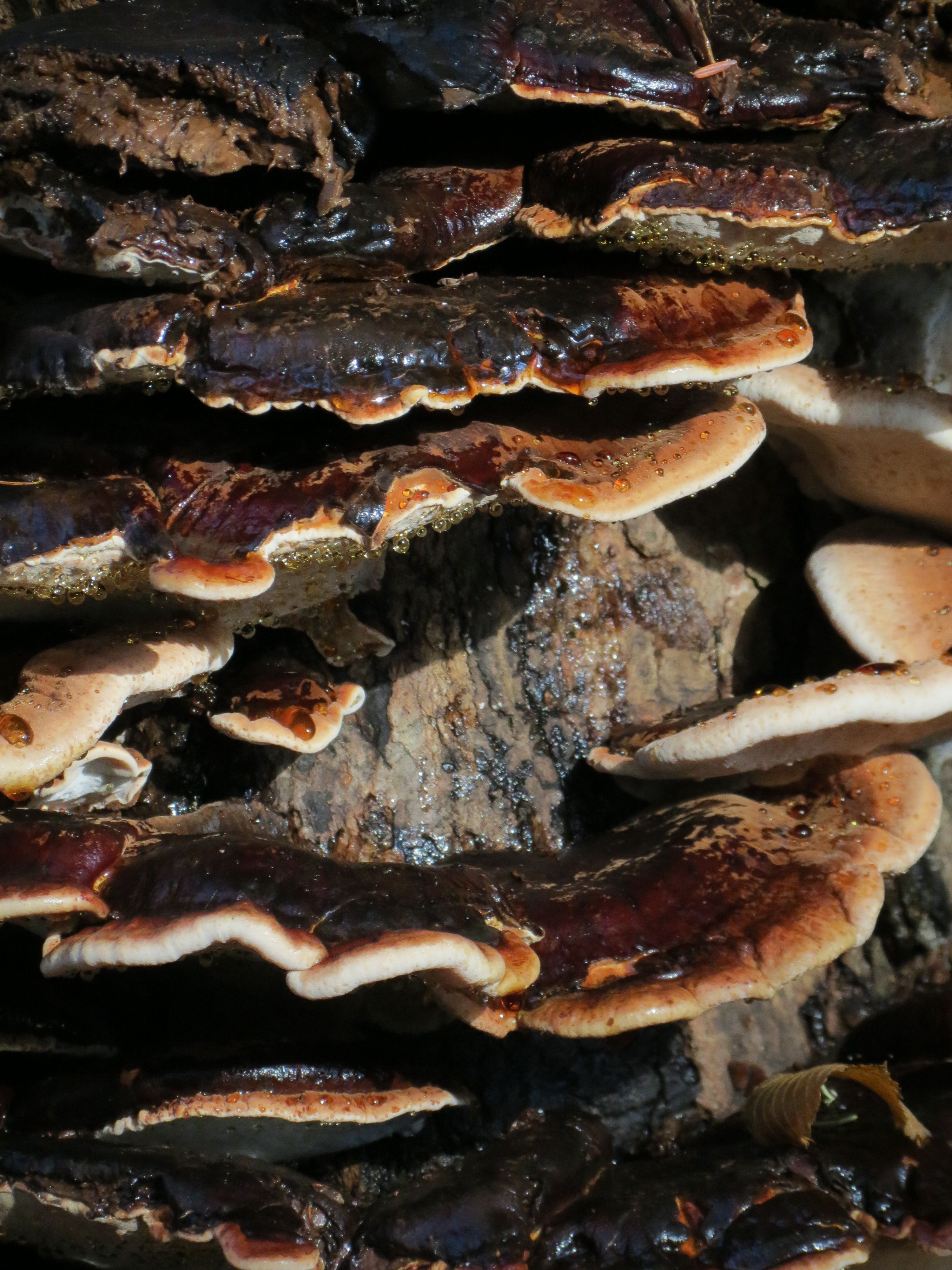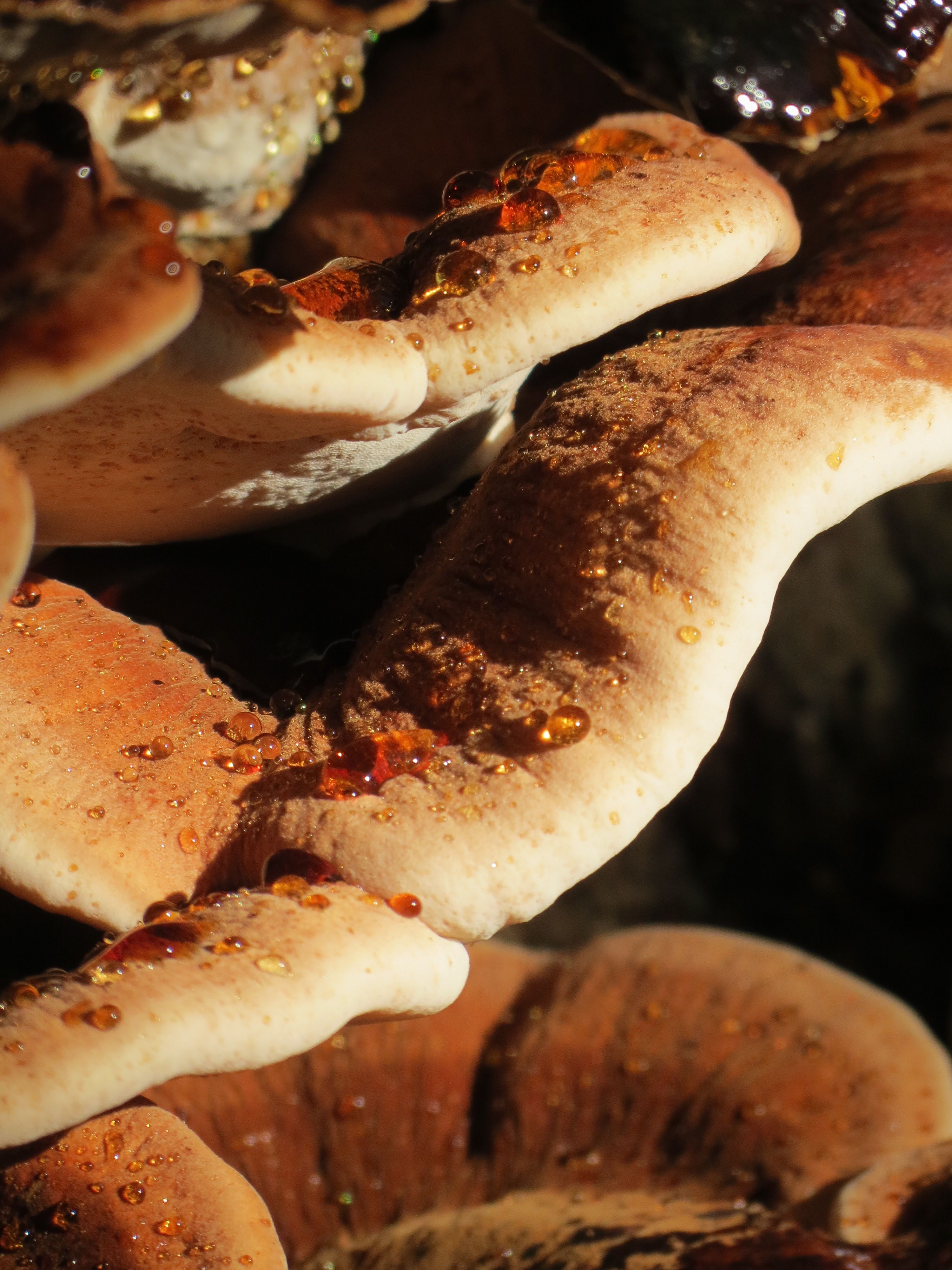 In an earlier post of mine, I referenced some unusual amber droplets collecting within and around some type of shelf / bracket fungus on a tree stump.    Here’s a few shots of the stump and the full fungal growth.     There is a discernible line of clear droplets forming underneath many of the fruiting bodies, with amber droplets forming both above and below the fruiting body.   It appears this is a common characteristic in many types of shelf / bracket fungi, but I still haven’t found a description of the function of the droplets or what causes the fungi to exude them.    It is rather interesting to observe, though I made no attempt to poke, touch, smell or otherwise interact with the sappy substance besides photographing it.  Image