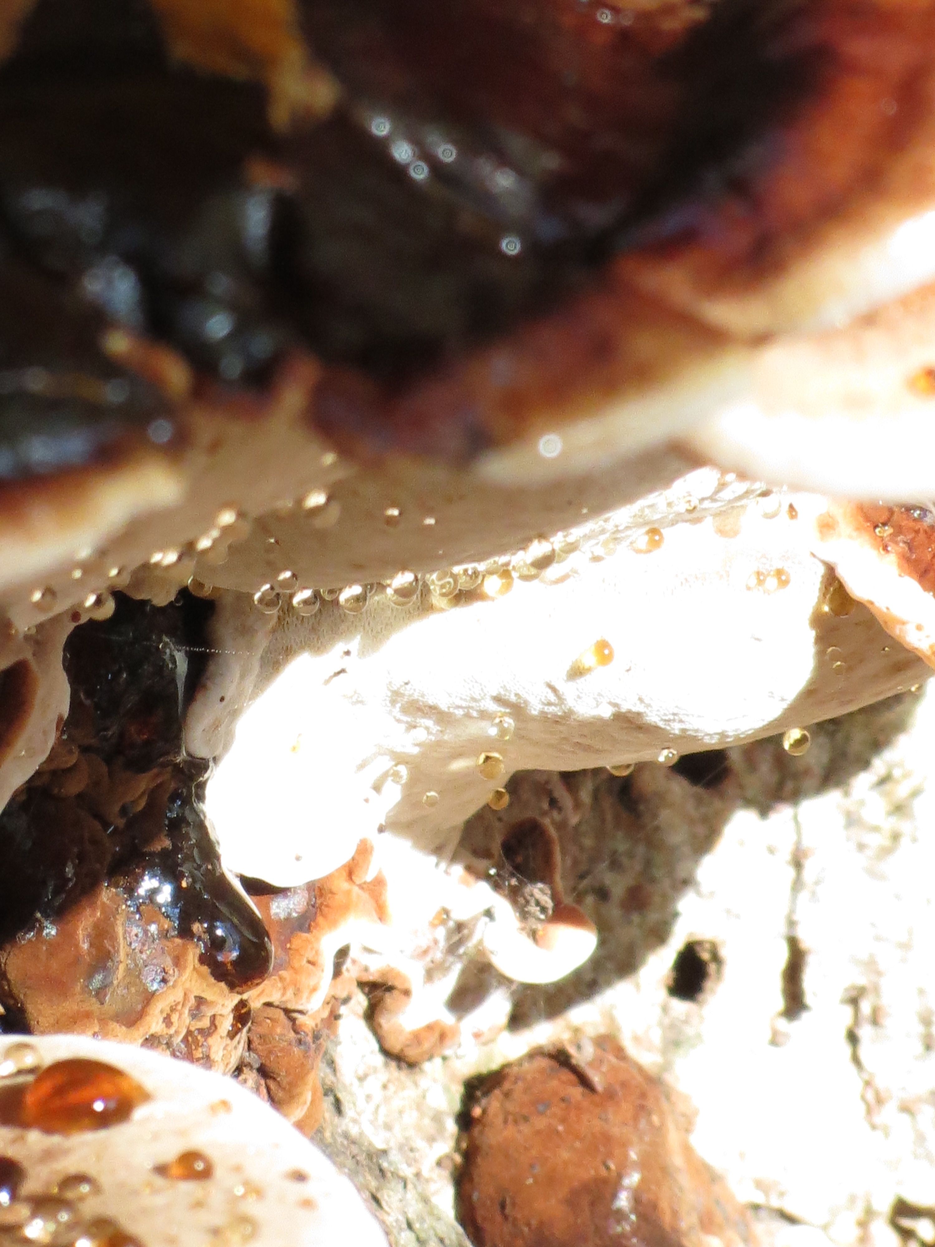 I wonder if the fungus is exuding actual tree sap because many of these fungi are parasitic.    In other cases, they grow on trees that have already fallen or died, so it works both ways.    A wikipedia entry about shelf fungus mentions the following “They can also be used as a wick in an oil/fat lamp. Use a shell, turtle shell, or non-burning oil/fat container. Prop fungus up using three little rocks. Place oil or fat in container. Once Bracket Fungus turns black and has absorbed oil it is ready to light.”    So they are able to absorb liquid/oil meaning the droplets they produce could be water or sap or perhaps some component of the phloem of the tree that they are absorbing?   I think I still have more questions then answers.  😉